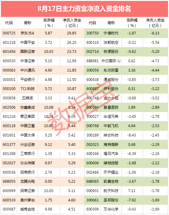 个股方面,118股主力资金净流入超亿元。其中京东方A净流入29.85亿元,资金流入规模居首,股价上涨5.87%。中国平安上涨3.72%、资金净流入26.2亿元。