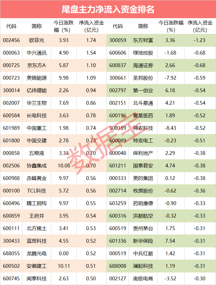 从个股方面看,4股尾盘主力资金净流入超亿元,分别是欧菲光、中兴通讯、京东方A和美锦能源,其中欧菲光尾盘主力资金净流入1.74亿元居首,股价涨幅3.93%,已连续2个交易日获得主力资金连续流入。中兴通讯获得尾盘资金1.54亿元,今日股价涨幅4.9%。