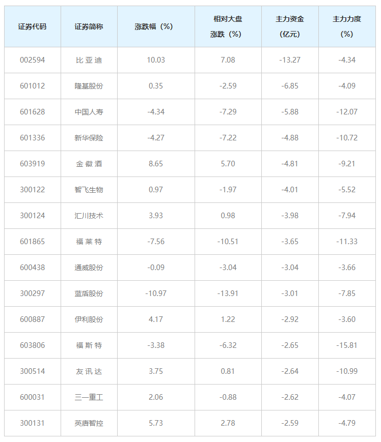 该概念所属个股共有1161只,其中主力资金净流出前列的个股是比 亚 迪、隆基股份、中国人寿,分别净流出13.27亿元、6.85亿元、5.88亿元。