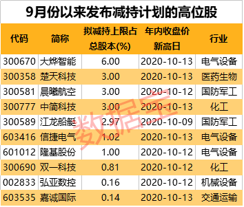 隆基股份股东拟减持不超过总股本1%,10月多只高位股股价计划减持。