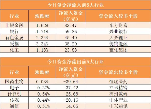 28个申万一级行业中,13个行业实现资金净流入,其中非银金融行业净流入83.47亿元居首。