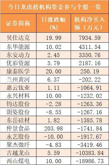 盘后龙虎榜数据显示,机构现身16股,其中贝仕达克等5股呈现机构资金净买入,西山煤电等11股呈现机构资金净卖出。