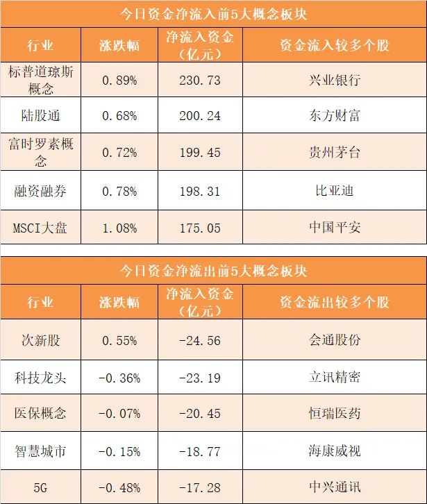 概念板块方面,今日标普道琼斯概念、陆股通、富时罗素概念、融资融券等概念板块资金呈现净流入,其中标普道琼斯概念净流入230.73亿元居首。