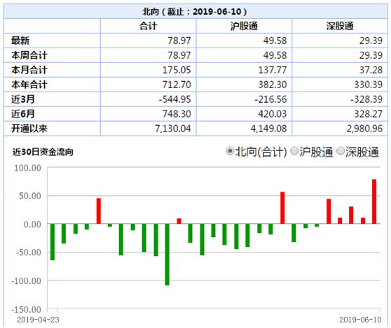 在经历了4、5月份的持续流出后,北上资金自6月以来连续净买入,5个交易日内,累计净流入A股175.05亿元。其中,6月10日,北上资金大举净流入78.97亿元,创今年3月29日以来新高。