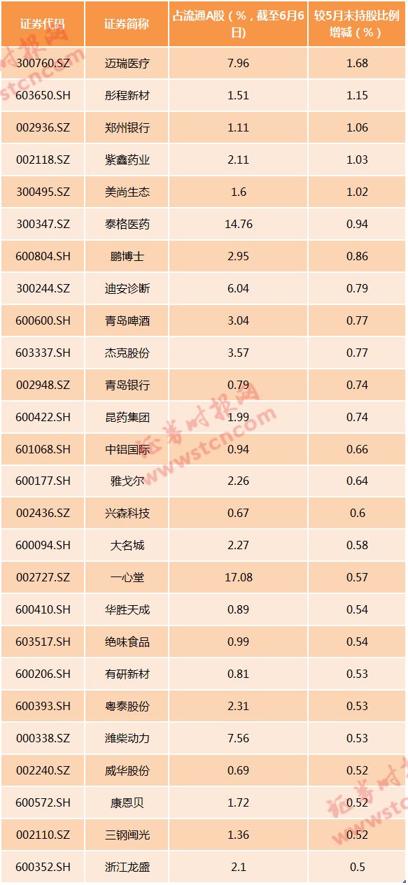 那么,北上资金6月以来主要加仓哪些个股呢?