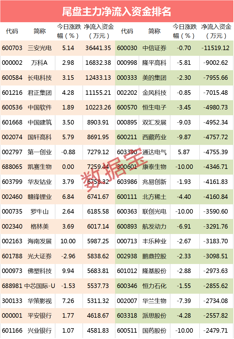 尾盘仅中信证券流出资金超亿元。午后中信建投再度异动,中信证券跟涨,资金拉高出逃,中信证券尾盘资金流出1.15亿元,中信建投尾盘流出1000余万元。