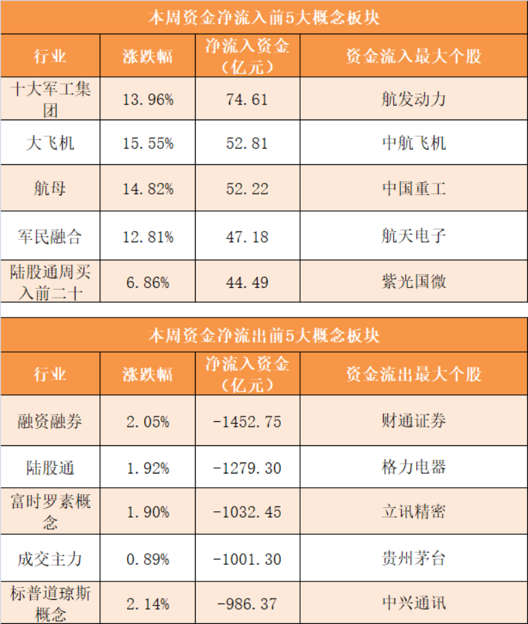 概念板块方面,本周十大军工集团、大飞机、航母、军民融合等概念板块资金呈现净流入,其中十大军工集团概念净流入74.61亿元居首。