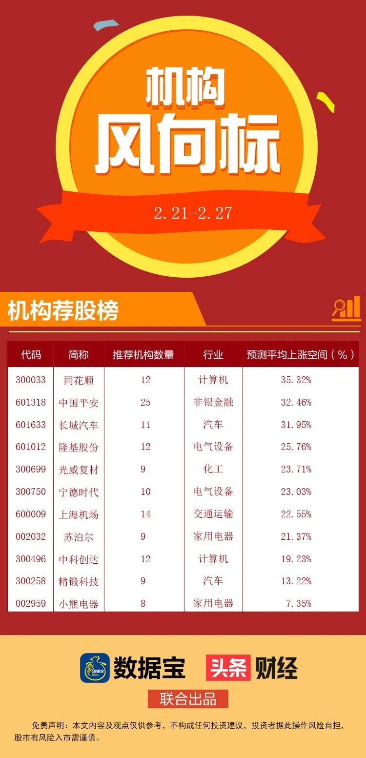 数据宝统计显示,近一周,超过7家机构给出买入型评级且超过2家机构给出目标价的个股中,将公布的目标价与今日收盘价相比,8股平均上涨空间超二成,分别是同花顺、中国平安、长城汽车、隆基股份、光威复材、宁德时代、上海机场、苏泊尔。