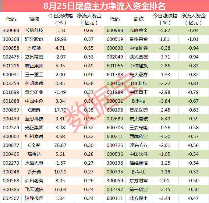 从个股尾盘资金流向数据看,4股尾盘净流入资金超5000万元,长信科技、汇金股份、五粮液等个股尾盘资金净流入金额最多,分别高达0.69亿元、0.57亿元和0.55亿元;赤峰黄金、贵州茅台、中信证券等个股尾盘资金净流出金额最多。