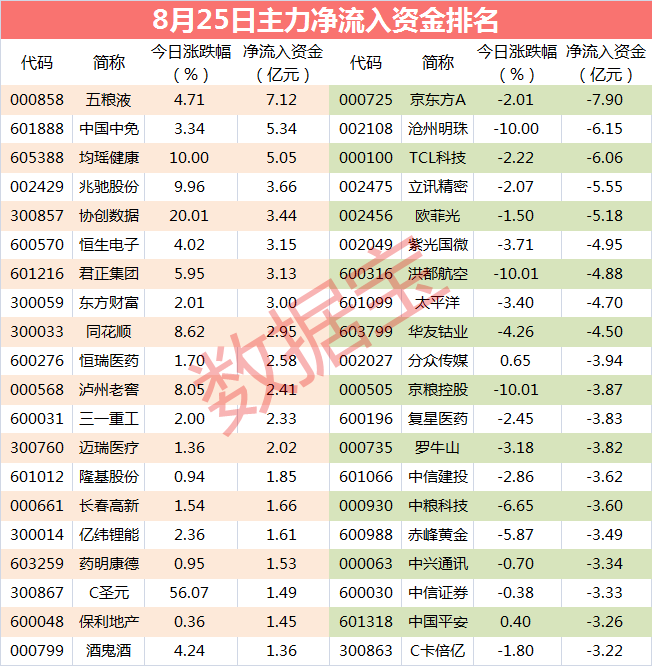 沪指8月25日下跌0.36%,主力资金全天净流出455.12亿元,已连续6个交易日资金呈净流出状态。其中,中小板主力资金净流出151.93亿元,创业板主力资金净流入41.06亿元,沪深300成份股主力资金净流出120.1亿元。