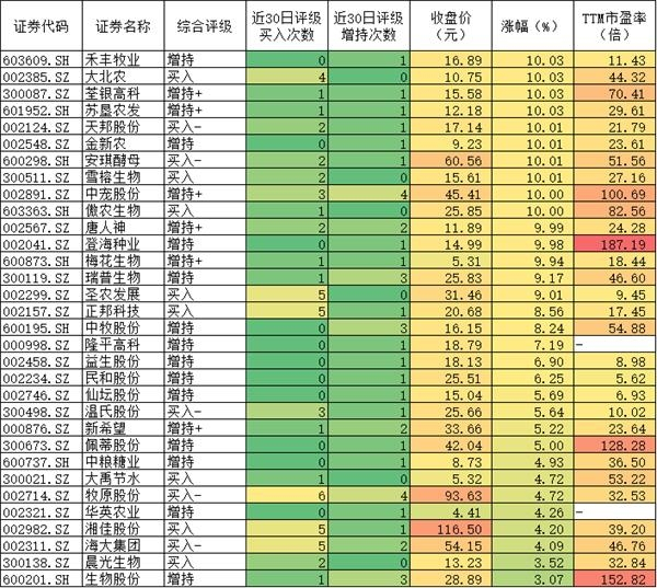 从机构评级来看,近30日内有36家农牧饲渔行业公司获得评级机构95次推荐类评级,其中,牧原股份获得机构6次买入评级和4次增持评级,包括海大集团(7次)、中宠股份(7次)、正邦科技(6次)等在内的10只个股均获得机构4次以上推荐评级。
