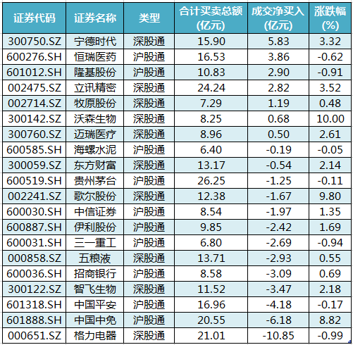 个股方面,宁德时代、恒瑞医药、隆基股份、立讯精密、牧原股份北向资金净买入金额居前,净买入金额分别为5.83亿元、3.86亿元、2.9亿元、2.82亿元、1.19亿元;格力电器、中国中免、中国平安、智飞生物、招商银行北向资金净卖出较多,净卖出金额分别为10.85亿元、6.18亿元、4.18亿元、3.47亿元、3.09亿元。