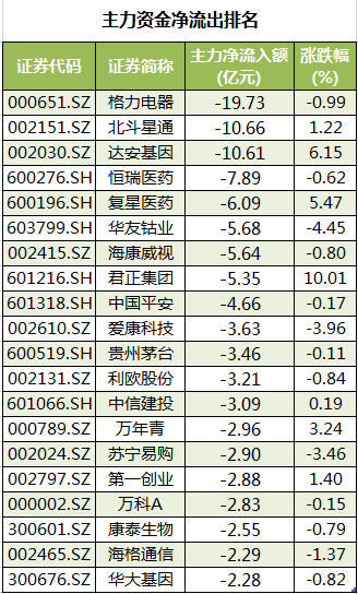 此外,93股被主力资金净卖出超亿元。其中,格力电器、北斗星通、达安基因、恒瑞医药、复星医药主力资金净流出较多,净流出金额分别为19.73亿元、10.66亿元、10.61亿元、7.89亿元、6.09亿元。
