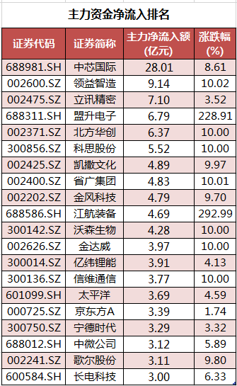 具体到个股来看,79股主力资金净流入超亿元。其中,中芯国际、领益智造、立讯精密、盟升电子、北方华创主力资金净流入居前,净流入金额分别为28.01亿元、9.14亿元、7.10亿元、6.79亿元、6.37亿元。