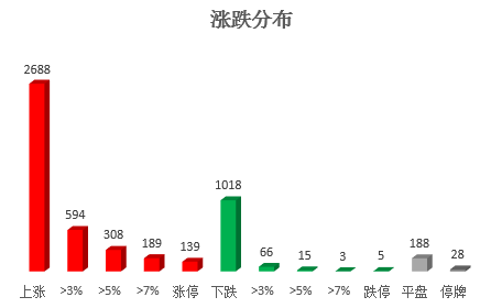 截至收盘,沪深两市合计2688只个股上涨,1018只个股下跌。包括ST股在内,共有139只个股涨停,5只个股跌停。
