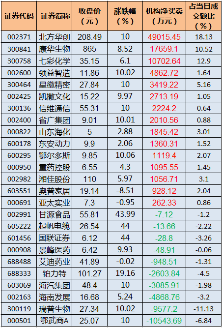 盘后龙虎榜数据显示,机构席位资金净买入6.85亿元,其中,净买入的个股15只,净卖出的个股10只。机构净买入最多的股票是北方华创,净买入金额为4.9亿元;机构净卖出最多的股票是鄂武商A,净卖出金额为10543.69万元。