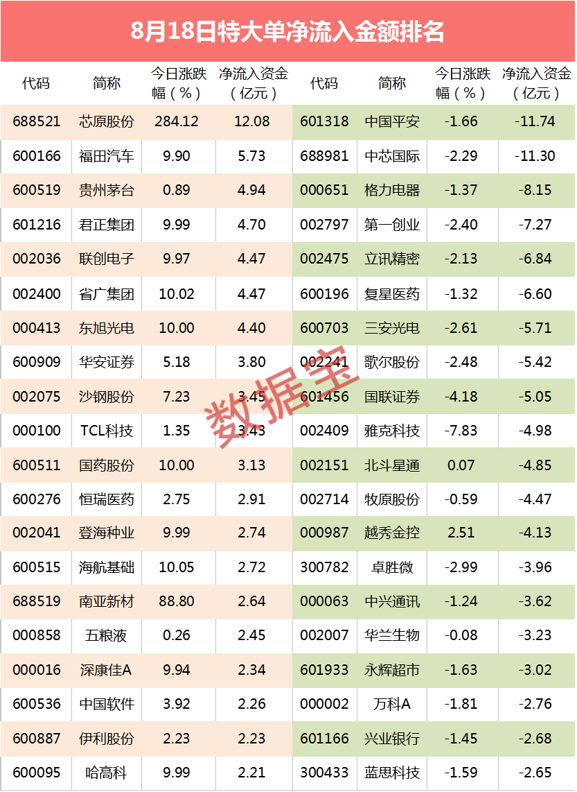 中国平安大单资金流出居首,净流出11.74亿元。今日保险、券商、银行等金融股普遍回调,华创阳安、国联证券等跌超4%。资金也集中流出金融股,第一创业、国联证券大单资金流出超5亿元,越秀金控、兴业银行、财通证券、海通证券等流出超2亿元。