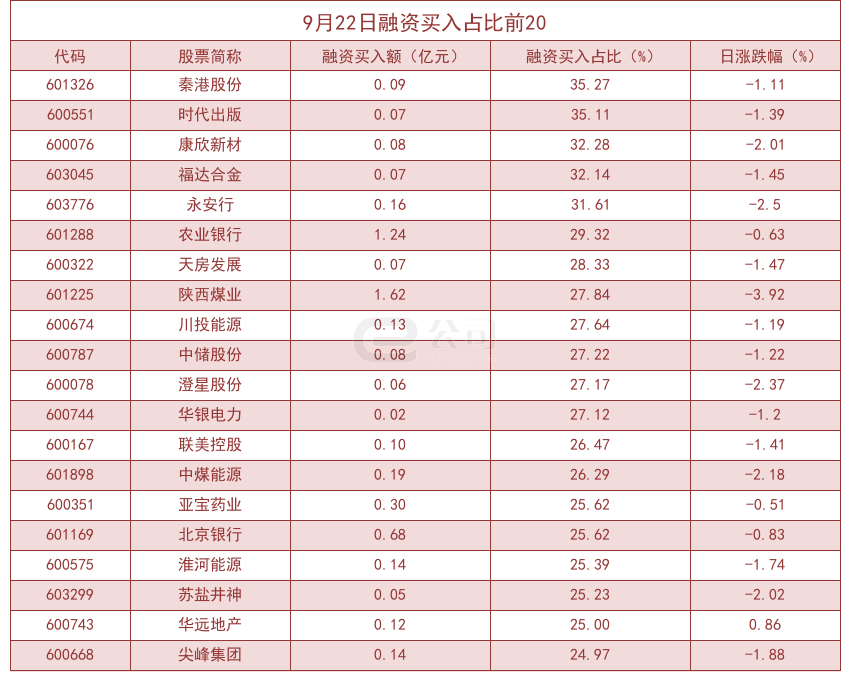 个股方面,沪深两市共有977只个股有融资资金买入。从融资买入额占当日总成交金额比重来看,共有56只股票融资买入额占比超20%,其中秦港股份(35.27%)、时代出版(35.11%)、康欣新材(32.28%)排名前三。