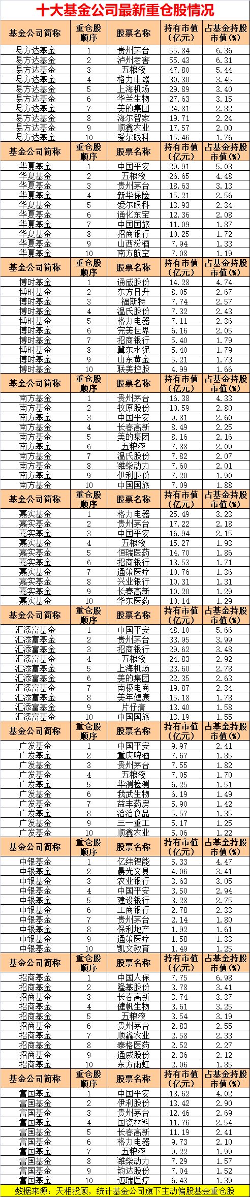 10大基金公司第一重仓股 茅台平安成常客,也有新能源巨头