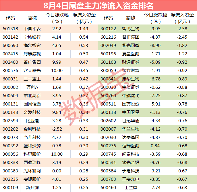 从个股尾盘资金流向数据看,仅1股尾盘净流入资金超亿元,中国平安、宁波银行、海尔智家等个股尾盘资金净流入金额最多,分别高达1.49亿元、0.54亿元和0.53亿元;智飞生物、君正集团和紫光国微等个股尾盘资金净流出金额最多。