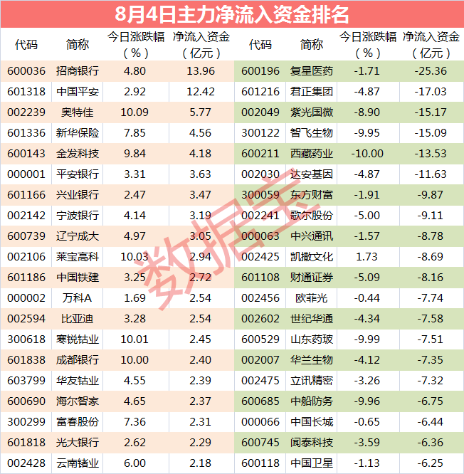 沪指8月4日上涨0.11%,主力资金全天净流出812.47亿元。其中,中小板主力资金净流出229.26亿元,创业板主力资金净流出163.1亿元,沪深300成份股主力资金净流出196.85亿元。