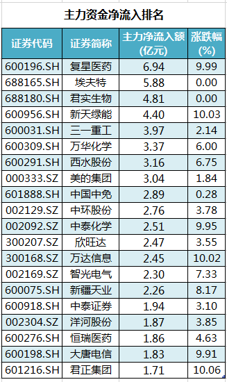 具体到个股来看,49股主力资金净流入超亿元。其中,复星医药、埃夫特、君实生物、新天绿能、三一重工主力资金净流入居前,净流入金额分别为6.94亿元、5.88亿元、4.81亿元、4.4亿元、3.97亿元。