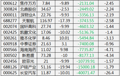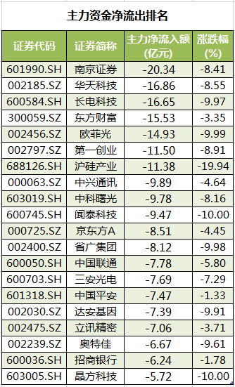 此外,309股被主力资金净卖出超亿元。其中,南京证券、华天科技、长电科技、东方财富、欧菲光主力资金净流出较多,净流出金额分别为20.34亿元、16.86亿元、16.65亿元、15.53亿元、14.93亿元。