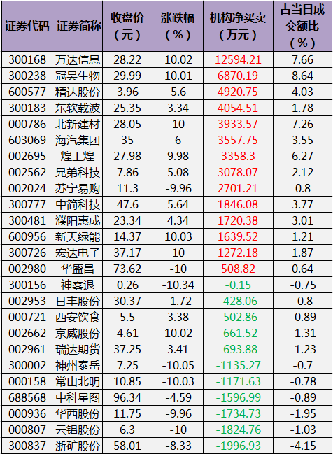 盘后龙虎榜数据显示,机构席位资金净卖出7.57亿元,其中,净买入的个股14只,净卖出的个股24只。机构净买入最多的股票是万达信息,净买入金额为12594.21万元;机构净卖出最多的股票是长安汽车,净卖出金额为40071.47万元。