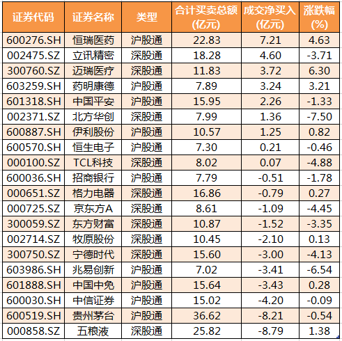 个股方面,恒瑞医药、立讯精密、迈瑞医疗、药明康德、中国平安北向资金净买入金额居前,净买入金额分别为7.21亿元、4.6亿元、3.72亿元、3.24亿元、2.26亿元;五粮液、贵州茅台、中信证券、中国中免、兆易创新北向资金净卖出较多,净卖出金额分别为8.79亿元、8.21亿元、4.2亿元、3.43亿元、3.41亿元。