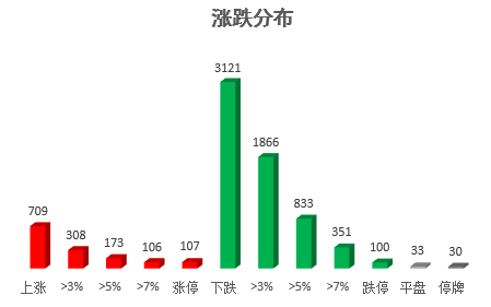 截至收盘,沪深两市合计709只个股上涨,3121只个股下跌。包括ST股在内,共有107只个股涨停,100只个股跌停。