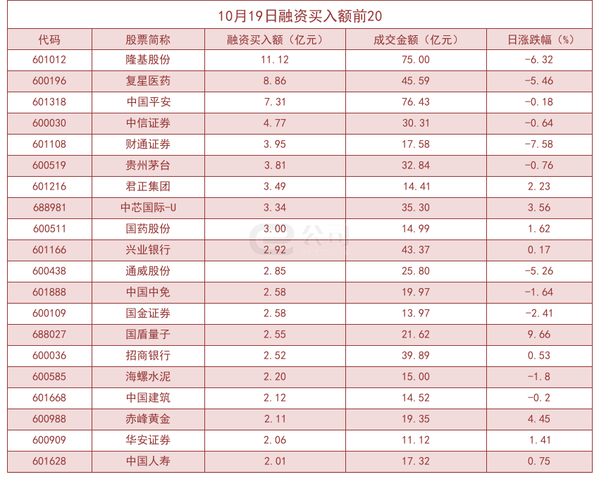 从融资资金买入金额来看,共有62只个股买入金额超亿元,其中隆基股份(11.12亿元)、复星医药(8.86亿元)、中国平安(7.31亿元)居前三位。
