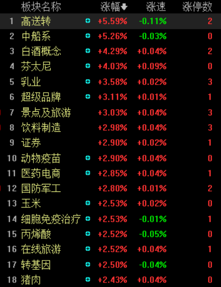板块上,白酒、食品饮料等大消费板块继续走强,银行、券商等大金融板块发力,医药疫苗板块止跌反弹,军工、农业、稀土等题材均有所表现。