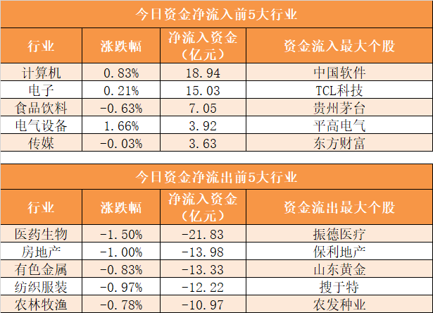 28个申万一级行业中,5个行业实现资金净流入,其中计算机行业净流入18.94亿元居首。