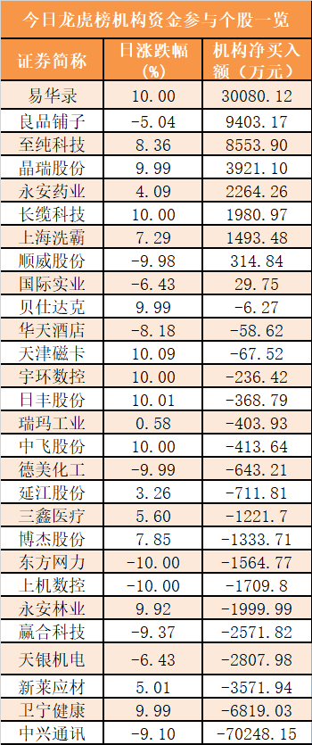 盘后龙虎榜数据显示,机构现身28股,其中易华录等9股呈现机构资金净买入,中兴通讯等19股呈现机构资金净卖出。