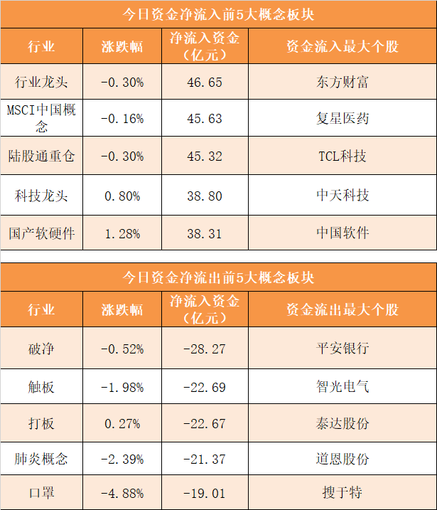 概念板块方面,今日行业龙头、MSCI中国概念、陆股通重仓、科技龙头等概念板块资金呈现净流入,其中行业龙头概念净流入46.65亿元居首。