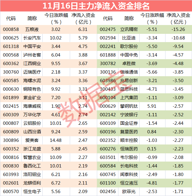 主力资金净流出个股中,立讯精密主力资金净流出15.26亿元,净流出资金最多;其次是比亚迪、歌尔股份,净流出资金分别为10.68亿元、9.54亿元。