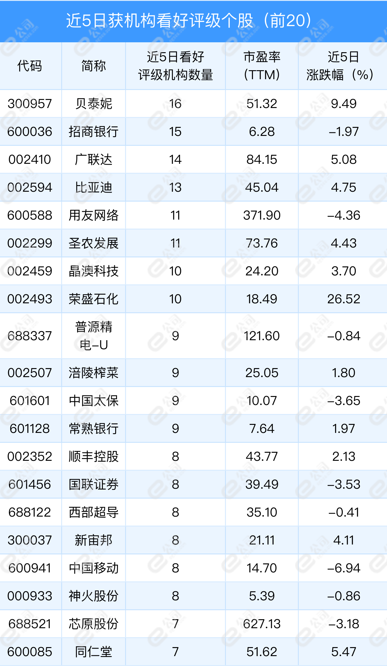 106只个股在近期被机构集中推荐,近5日内机构给予“买入”或“增持”等看好评级家数均逾3家及以上。具体来看,贝泰妮(16家)、招商银行(15家)、广联达(14家)、比亚迪(13家)、用友网络(11家)、圣农发展(11家)、晶澳科技(10家)、荣盛石化(10家)等8只个股近期机构看好评级家数居前,均达到5家以上,此外,包括巨星农牧、奥浦迈、三未信安、金龙鱼、伯特利等在内的30只个股期间机构看好评级家数均在2家以上。