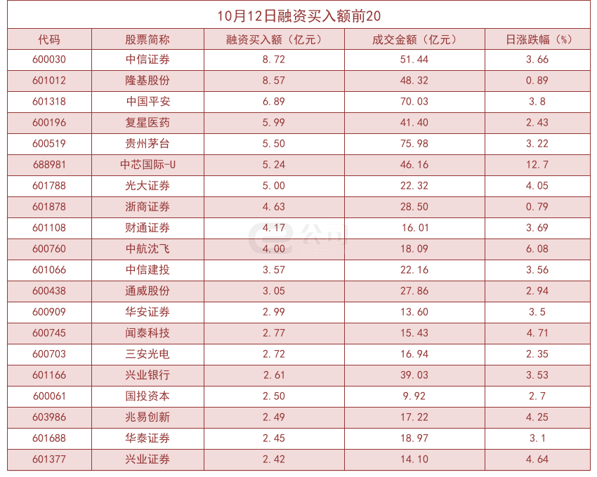 从融资资金买入金额来看,共有81只个股买入金额超亿元,其中中信证券(8.72亿元)、隆基股份(8.57亿元)、中国平安(6.89亿元)居前三位。