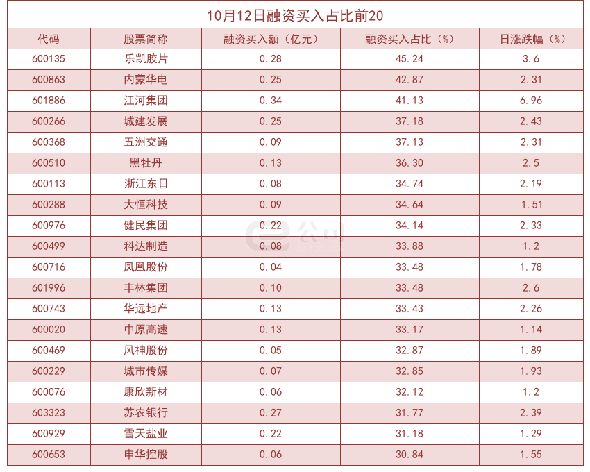 个股方面,沪深两市共有980只个股有融资资金买入。从融资买入额占当日总成交金额比重来看,共有100只股票融资买入额占比超20%,其中乐凯胶片(45.24%)、内蒙华电(42.87%)、江河集团(41.13%)排名前三。