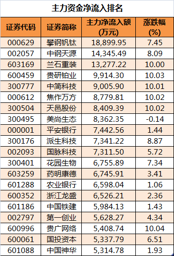 个股方面,仅有3只个股主力资金净流入超亿元,攀钢钒钛主力资金净流入1.89亿元,净流入资金居首;中钢天源、兰石重装紧随其后,全天净流入资金分别为1.43亿元、1.33亿元;全天净流入资金较多的还有贵研铂业、中简科技等。