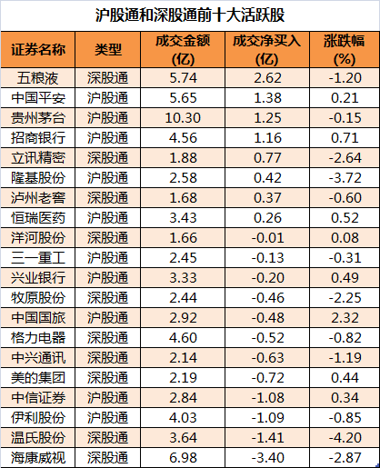 个股方面,五粮液、中国平安、贵州茅台分别获北上资金净买入2.62亿元、1.38亿元、1.25亿元;海康威视、温氏股份、伊利股份分别被净卖出3.40亿元、1.41亿元、1.09亿元。此外,贵州茅台获北上资金买入、卖出总额达10.30亿元,交易最为活跃。