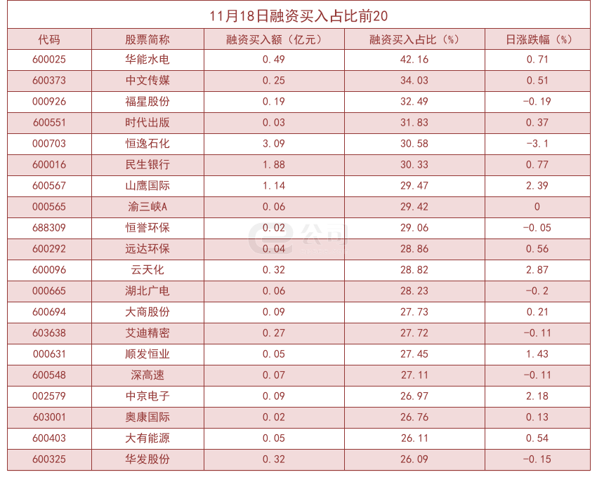 个股方面,沪深两市共有1843只个股有融资资金买入。从融资买入额占当日总成交金额比重来看,共有98只股票融资买入额占比超20%,其中华能水电(42.16%)、中文传媒(34.03%)、福星股份(32.49%)排名前三。