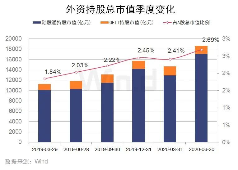 随着上市公司半年报披露完毕,作为“聪明资金”的外资投资路径亦随之曝光。今年二季度末, 外资在A股市场话语权逐步提升,QFII、陆股通持股市值总和达18599亿,占全部A股总市值比例2.69%,较一季度末上升0.28个百分点。