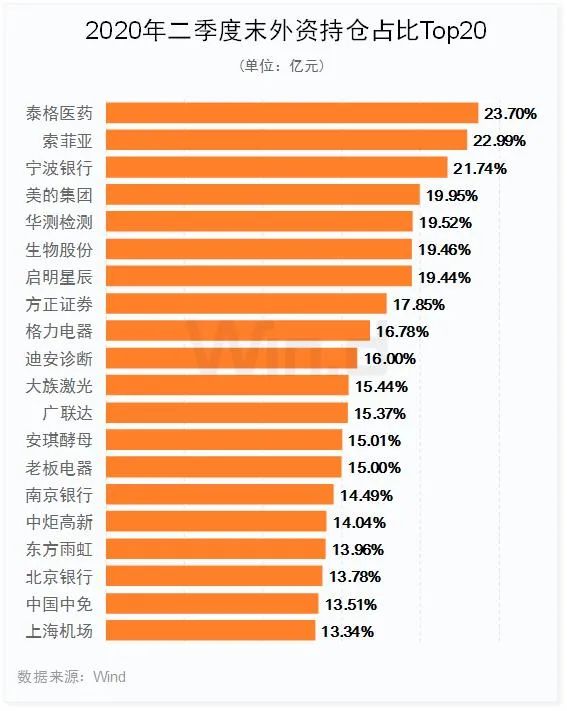 从QFII、陆股通合计持股数量占总股本比例来看,泰格医药、索菲亚、宁波银行持股占比均超过20%,美的集团、华测检测、生物股份、启明星辰、方正证券等33股持股占比均超过10%。