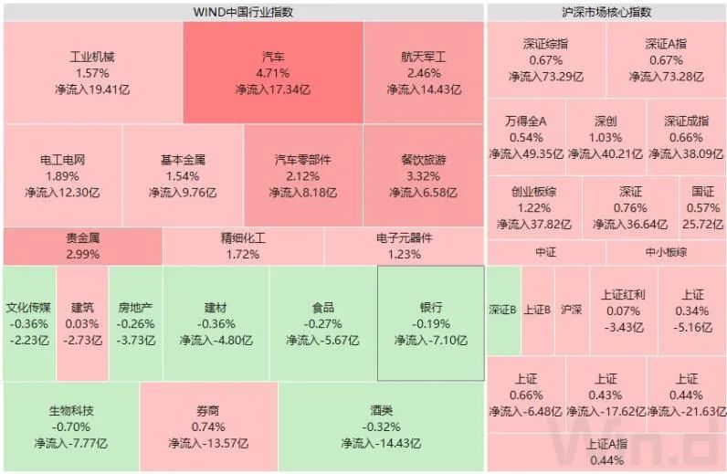 板块方面,分化以及轮动依然成为主流,汽车板块、军工以及贵金属迎来上涨,科技股盘中也有反弹的迹象。而反观近期“大红大紫”的食品消费板块迎来了回调调整,银行板块则是连续两日拖累指数走势较弱,券商则是尾盘拉升带动A股尾盘上攻,但是力度较弱。