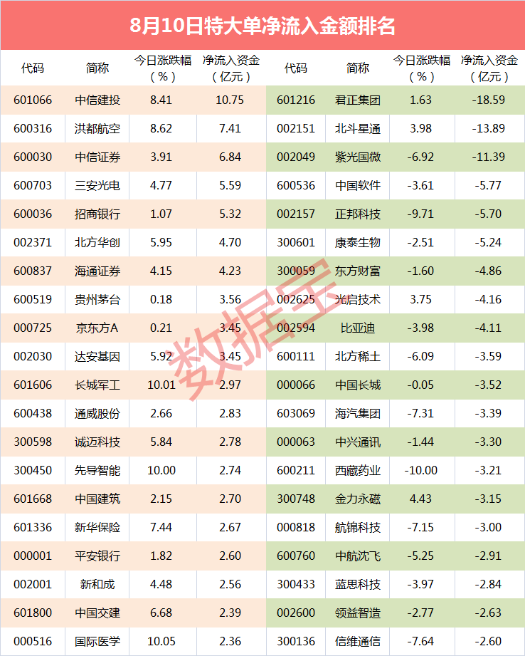 紧随其后是洪都航空,特大单资金净流入为7.41亿元。中信证券大单资金净流入排名第三,为6.84元。