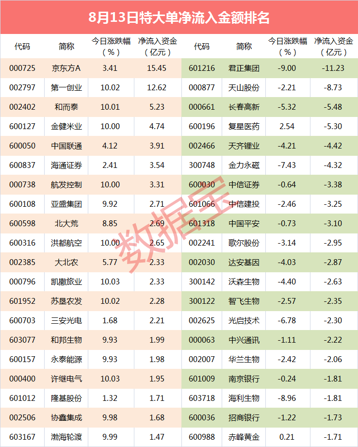 个股来看,两市有14只股票获特大单净流入超2亿元。京东方A特大单资金净流入居首,为15.45亿元。紧随其后是第一创业,特大单资金净流入为12.62亿元。8月13日午后,市场传出消息“中国计划将国内券商第一创业与首创证券合并,首创证券因此推迟了正在进行的IPO计划。两家公司的合并最早可能在今年敲定”。受此消息影响,第一创业股价瞬间涨停。和而泰大单资金净流入排名第三,为5.23亿元。