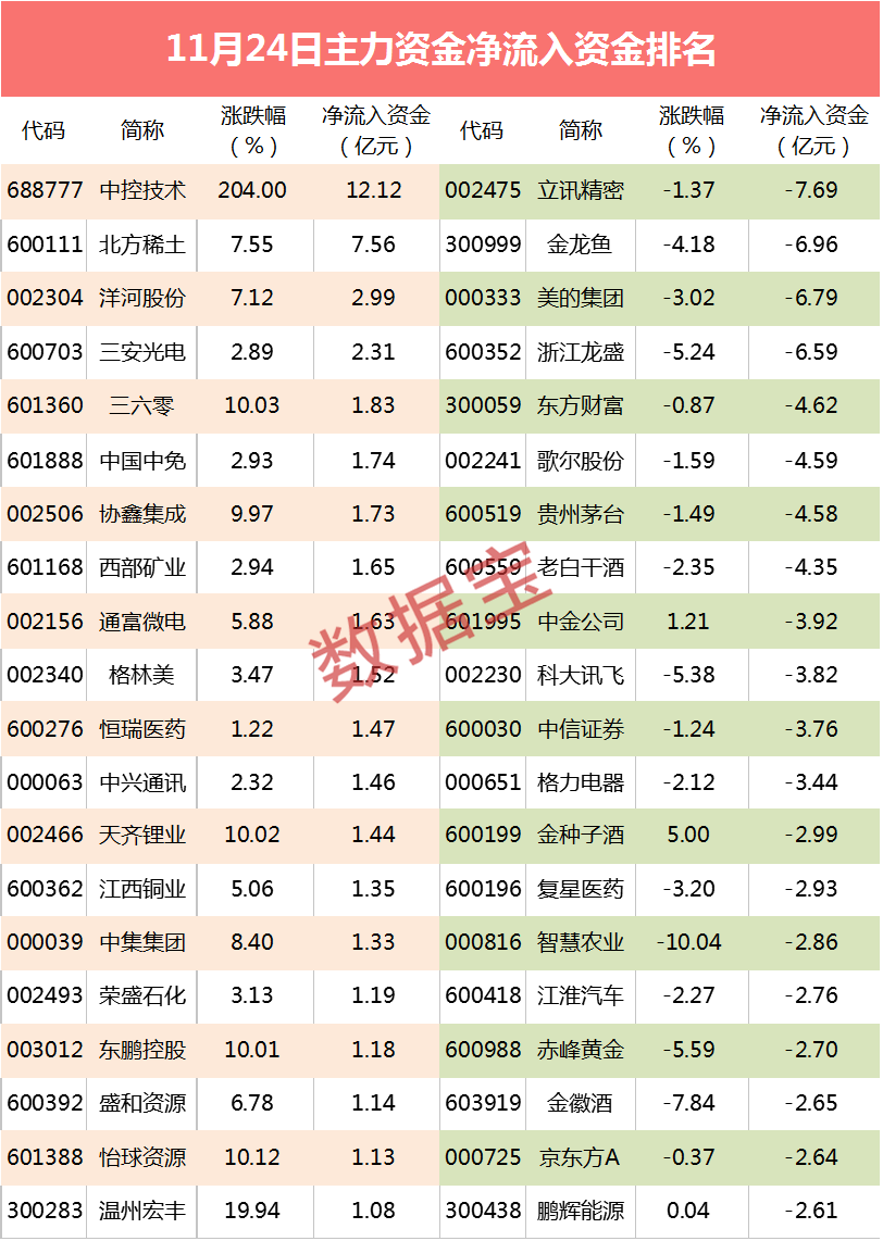 两市22股流入资金超亿元。次新股中控技术流入资金居首,净流入12.12亿元,中控技术的主要产品包括自动化控制系统、工业软件、自动化仪表及运维服务。