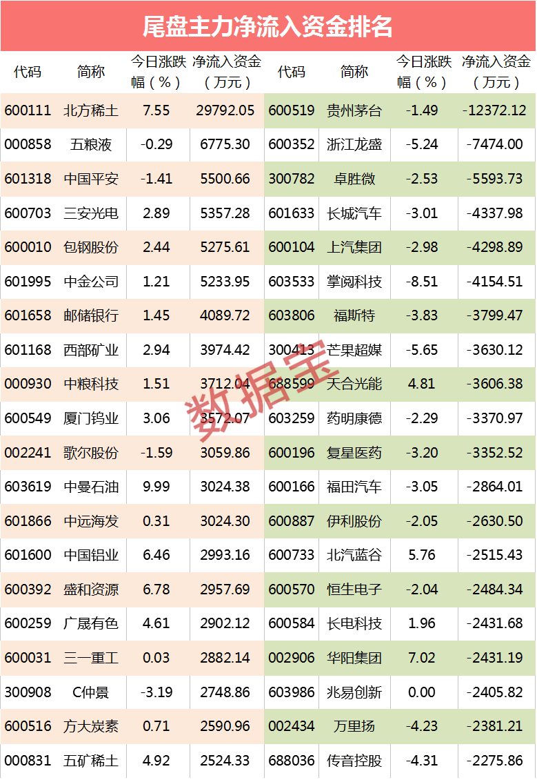 尾盘北方稀土资金流入2.98亿元居首,公司股价尾盘一度冲击涨停,值得关注是,公司近日公告第二大股东累计减持公司股份3600万股,减持总金额为4.29亿元。五粮液尾盘资金流入超6000万元。贵州茅台尾盘流出资金1.24亿元,浙江龙盛流出资金超7000万元。