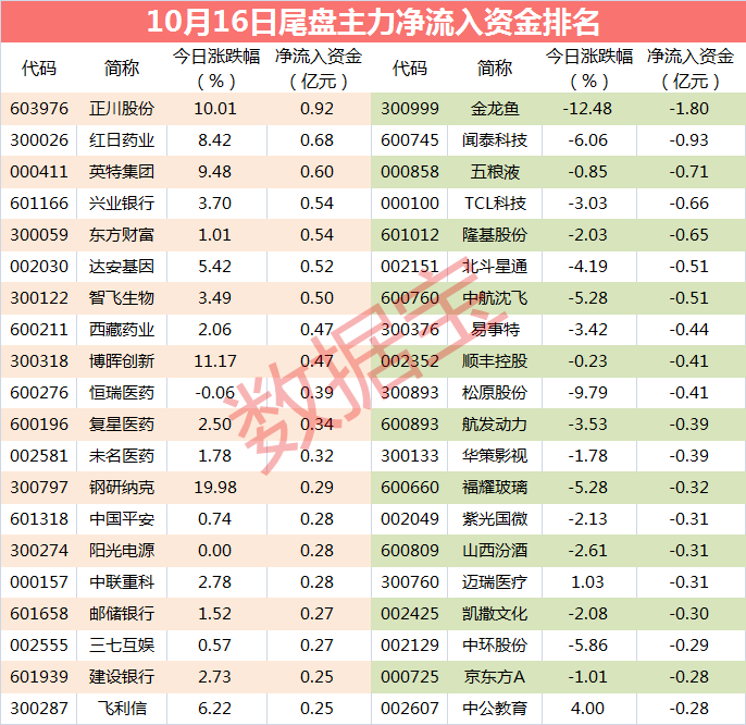 主力资金净流出个股中,C金龙鱼主力资金净流出10.2亿元,净流出资金最多;其次是闻泰科技、京东方A,净流出资金分别为8亿元、6.94亿元。